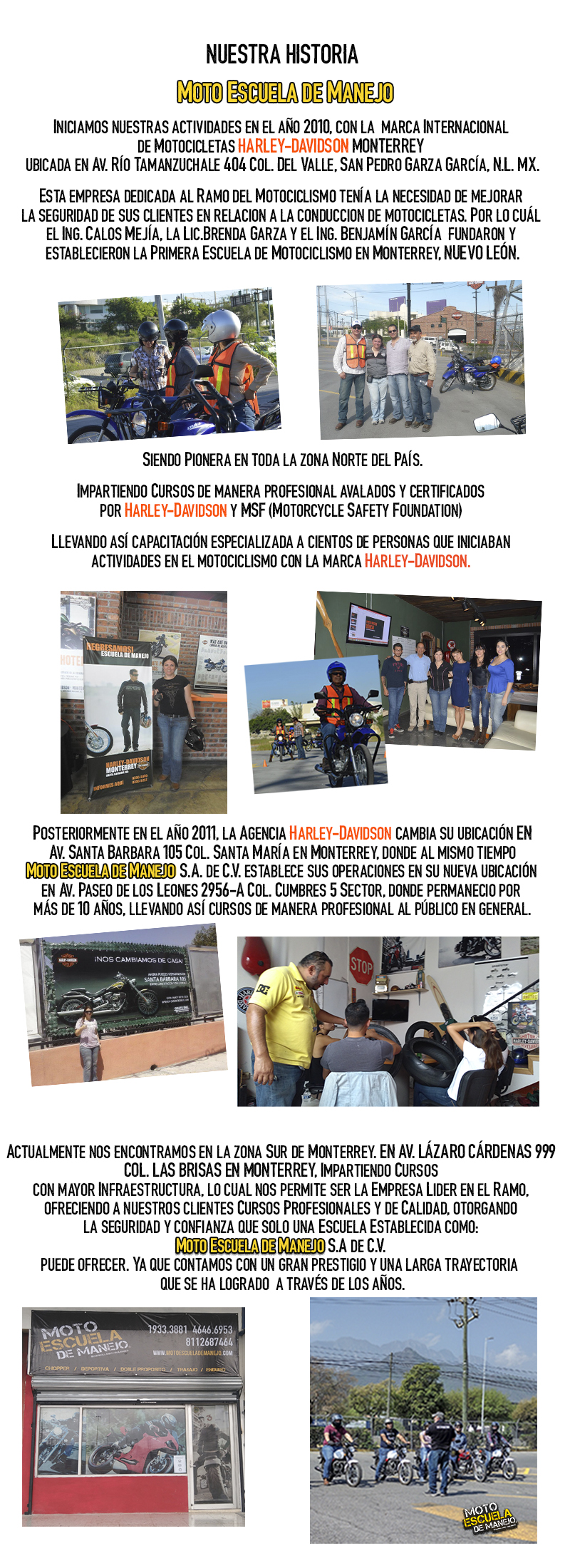 Nuestra Historia Moto Escuela de Manejo. Iniciamos nuestras actividades en el año 2010 con la prestigiada marca Internacional de motocicletas Harley-Davidson Impartiendo Cursos de manera profesional avalados y certificados por Harley-Davidson y MSF (Motorcycle Safety Foundation) Llevando así capacitación especializada a cientos de personas que iniciaban en el ramo del motociclismo con la marca Harley-Davidson. Posteriormente la Agencia Harley-Davidson cambia su ubicación en el año 2011 Av. Santa Barbara 105 Col. Santa María en Monterrey, donde al mismo tiempo. Moto Escuela de Manejo S.A. de C.V. establece sus operaciones en su nueva ubicación en Av. Paseo de los Leones 2956-A Col. Cumbres 5 Sector, donde permanecio por más de 10 años, llevando así cursos de manera profesional al público en general.Actualmente nos encontramos en la zona Sur de Monterrey Impartiendo Cursos con mayor Infraestructura, lo cual nos permite ser la Empresa Lider en el Ramo, ofreciendo a nuestros clientes Cursos Profesionales y de Calidad, otorgando la seguridad y confianza que solo una Escuela Establecida como: Moto Escuela de Manejo S.A de C.V puede ofrecer.Ya que contamos con una larga trayectoria y un gran prestigio que se ha logrado a traves de los años.